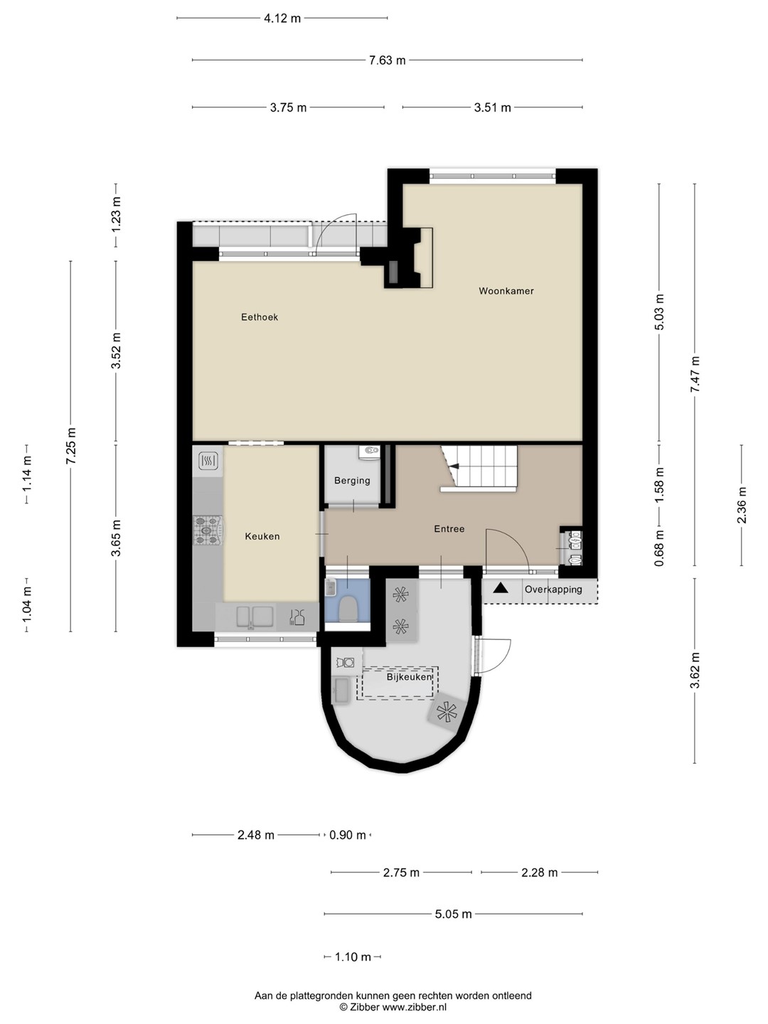 • Bijkeuken met lichtkoepel, via binnendeur bereikbaar, met werkblad en aansluitingen wasmachine en droger
