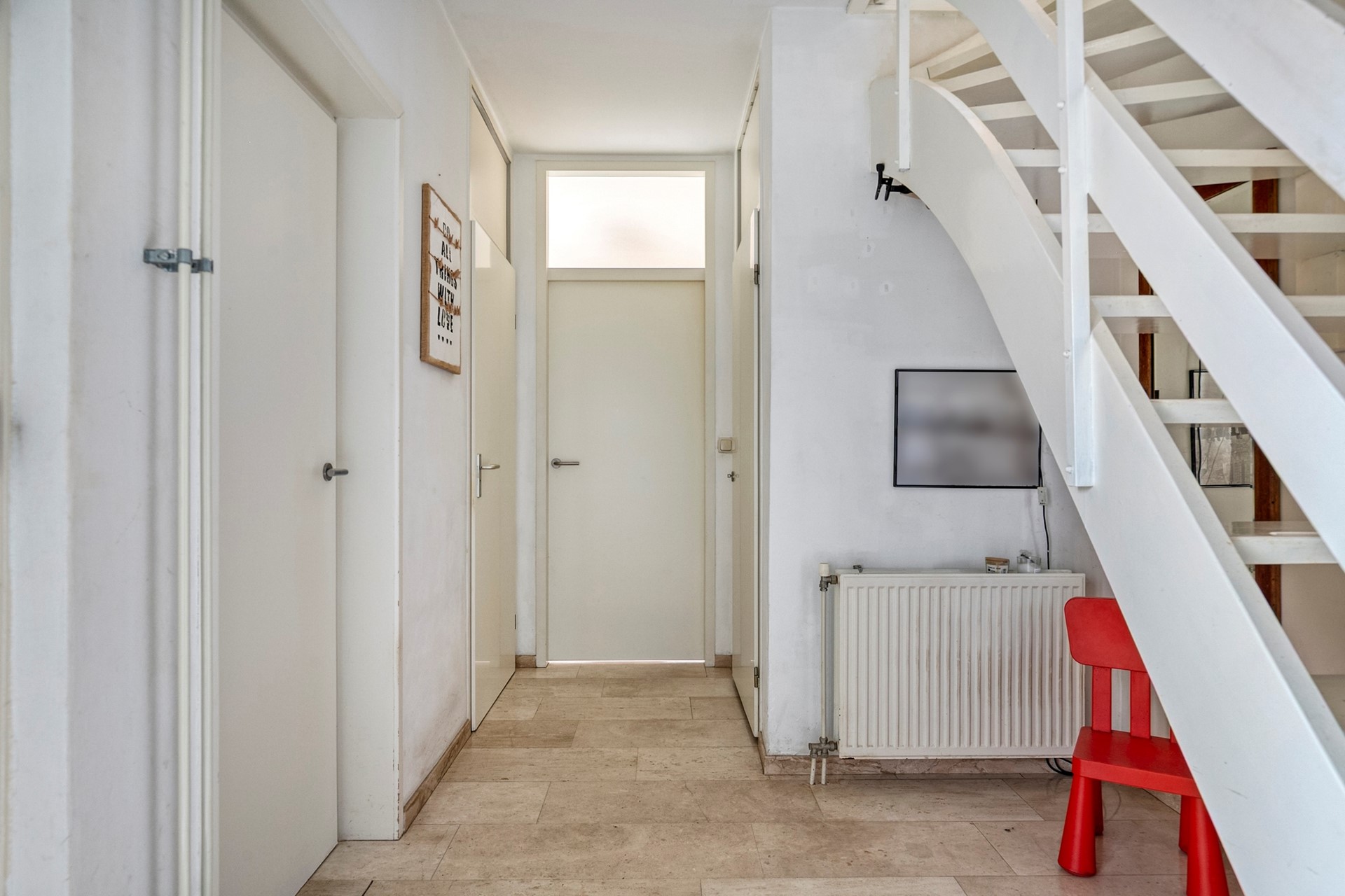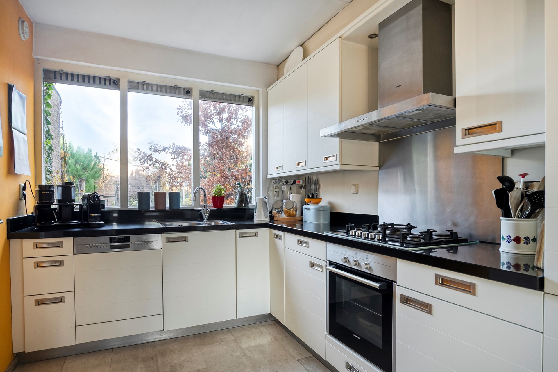De grote ramen en lichte afwerking zorgen voor een prettige, ruimtelijke sfeer. De woonkamer met open haard is tuingericht en biedt een prachtig uitzicht op de diepe, groene achtertuin. Op de begane grond vind je daarnaast een ruime keuken (met inbouwapparatuur uit 2017), een hal met veel bergruimte en een nette toiletruimte.