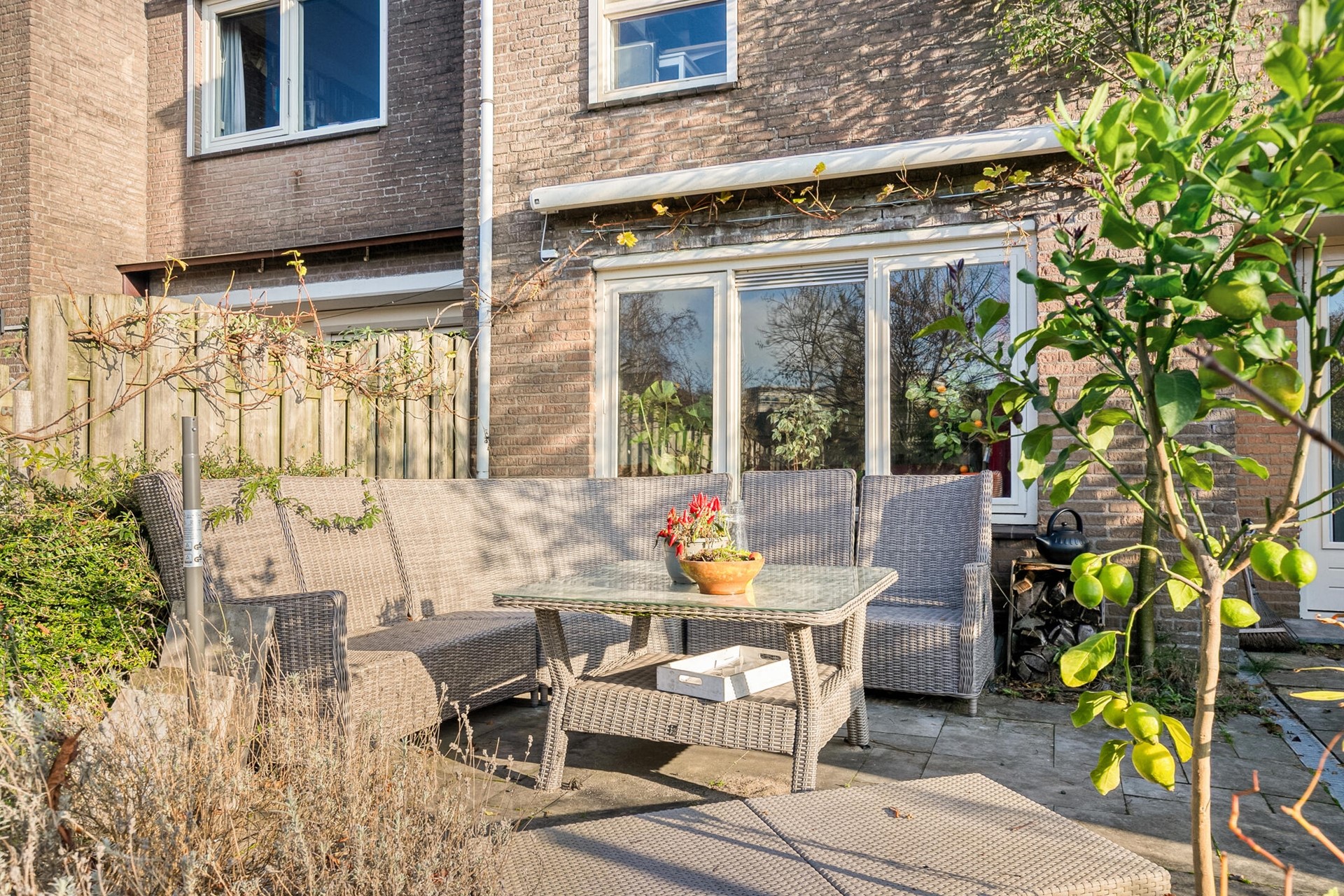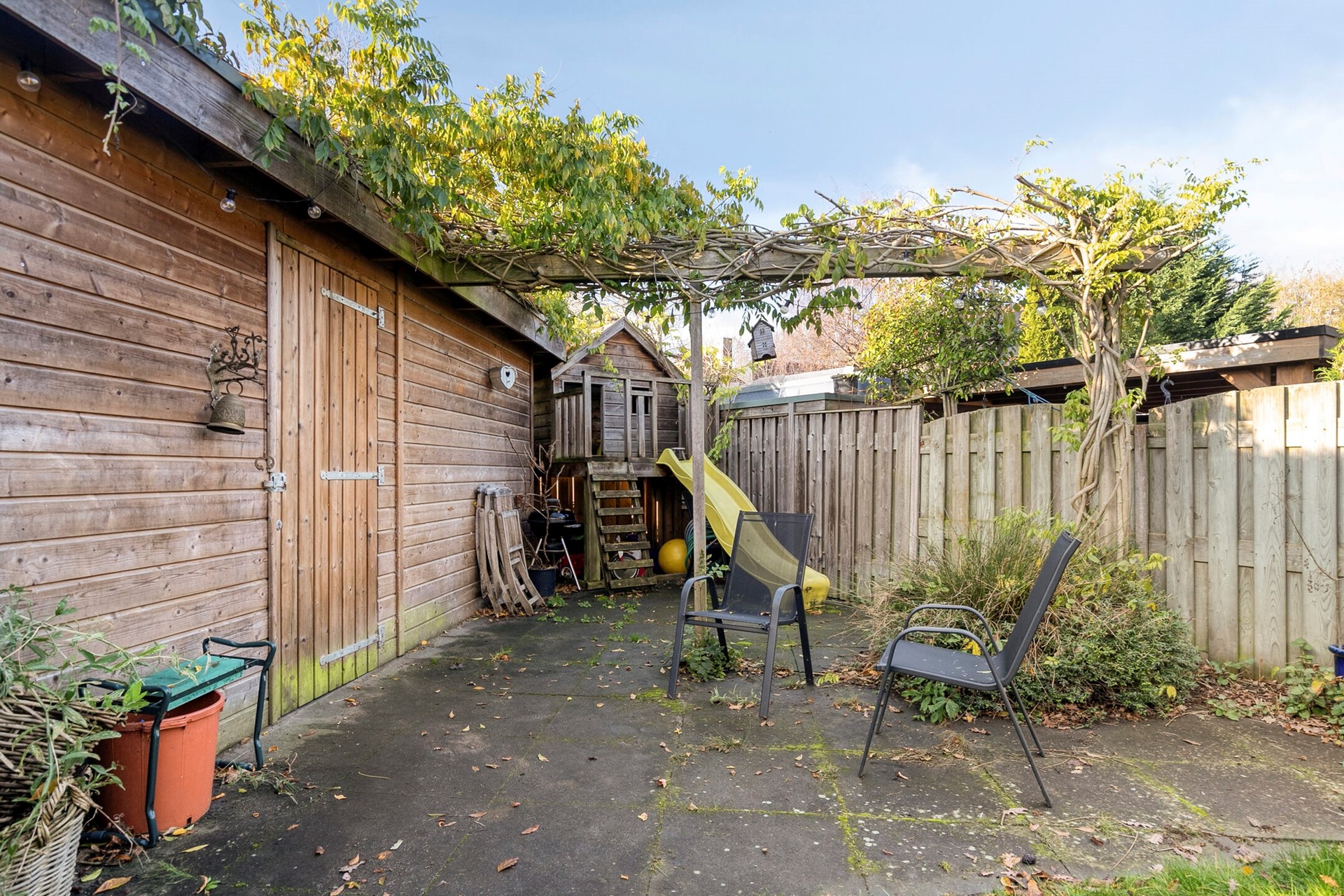 De diepe achtertuin is een grote plus. Deze ligt gunstig op het westen, heeft veel privacy en biedt ruimte voor meerdere zitplekken. Achterin staat een grote houten berging (2018), ideaal voor opslag, hobby’s of motorstalling.