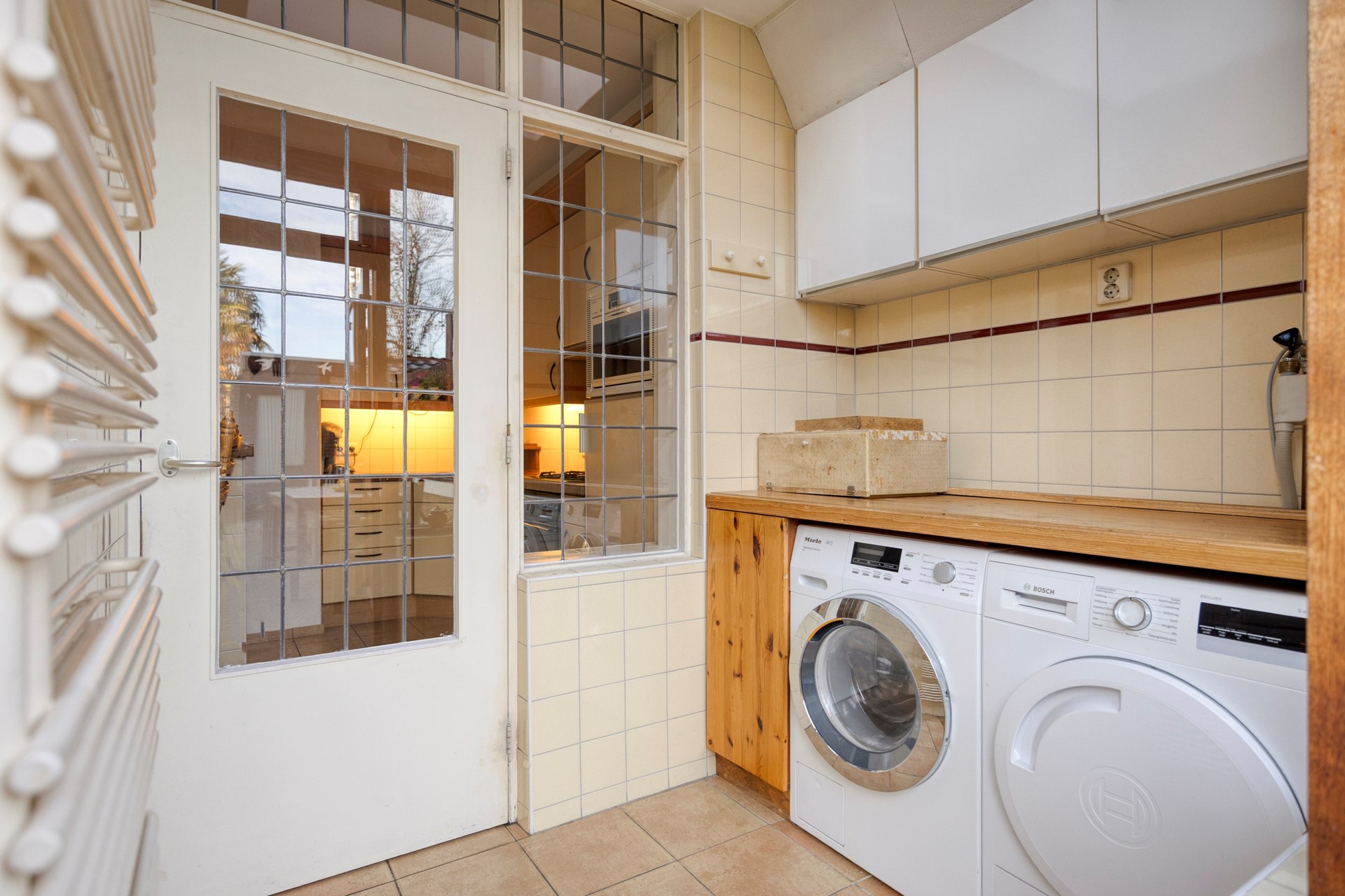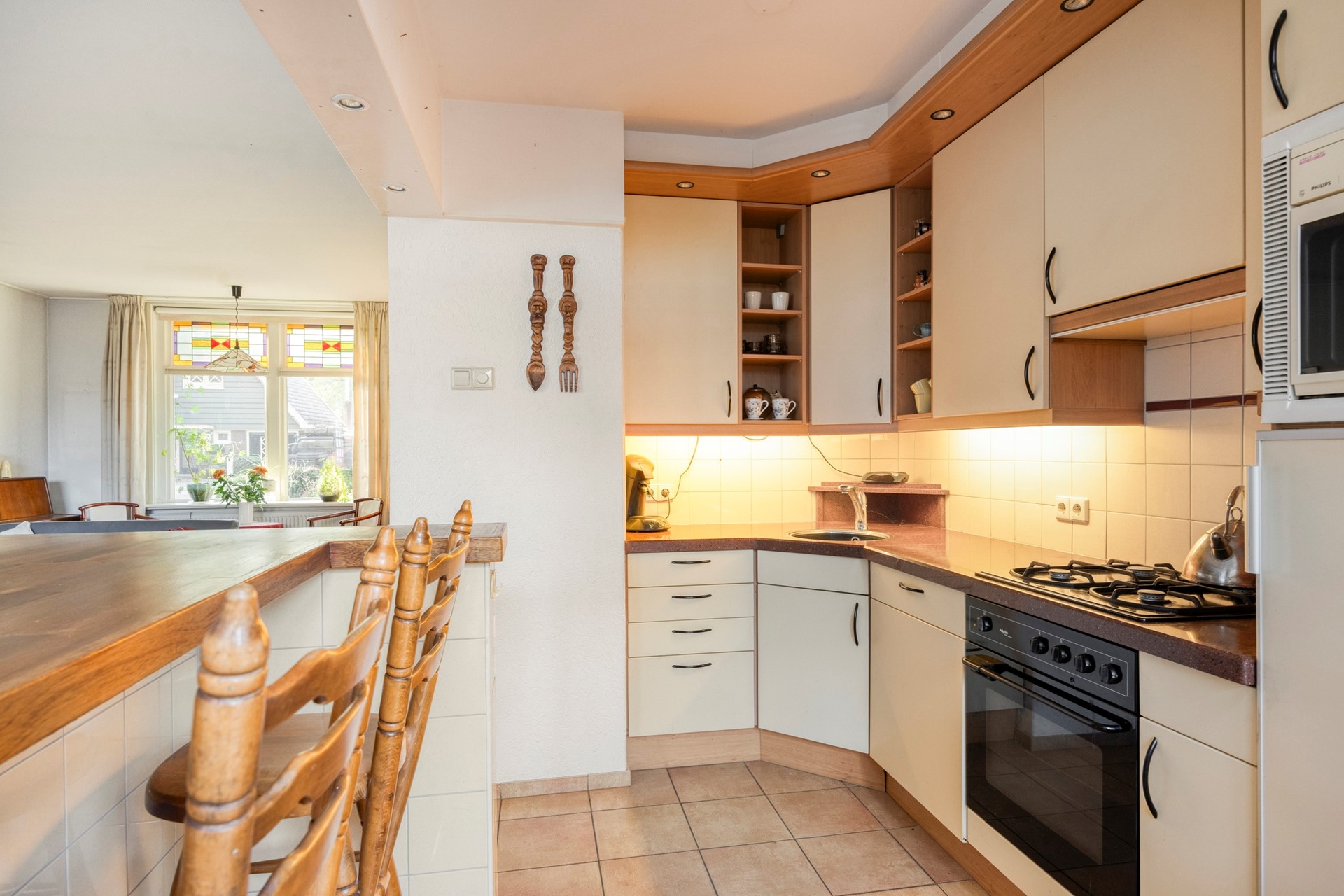 Aan de achterzijde van de woning bevindt zich de keuken, die in open verbinding staat met het eetgedeelte. Hier is ruimte voor een gezellige eethoek waar je uitkijkt op de tuin. De keuken beschikt over diverse opbergmogelijkheden en een bar met zitplaatsen, ideaal voor een snelle koffie in de ochtend of een goed gesprek tijdens het koken. Aansluitend vind je de praktische bijkeuken met aansluitingen voor wasmachine en droger.