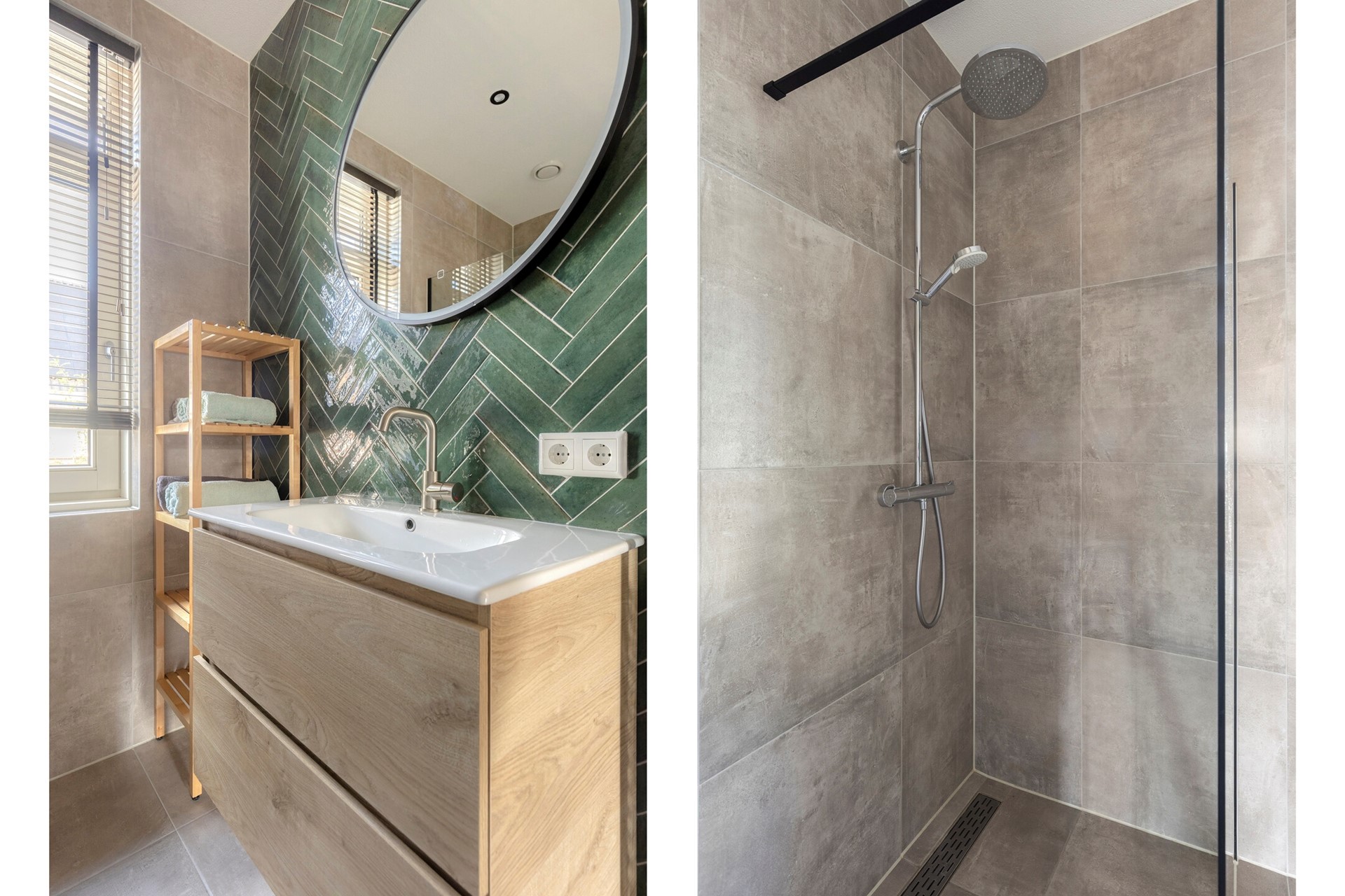 De luxe badkamer is stijlvol afgewerkt en uitgerust met een ruime inloopdouche, modern wastafelmeubel en toilet. Een plek waar comfort en ontspanning samenkomen.