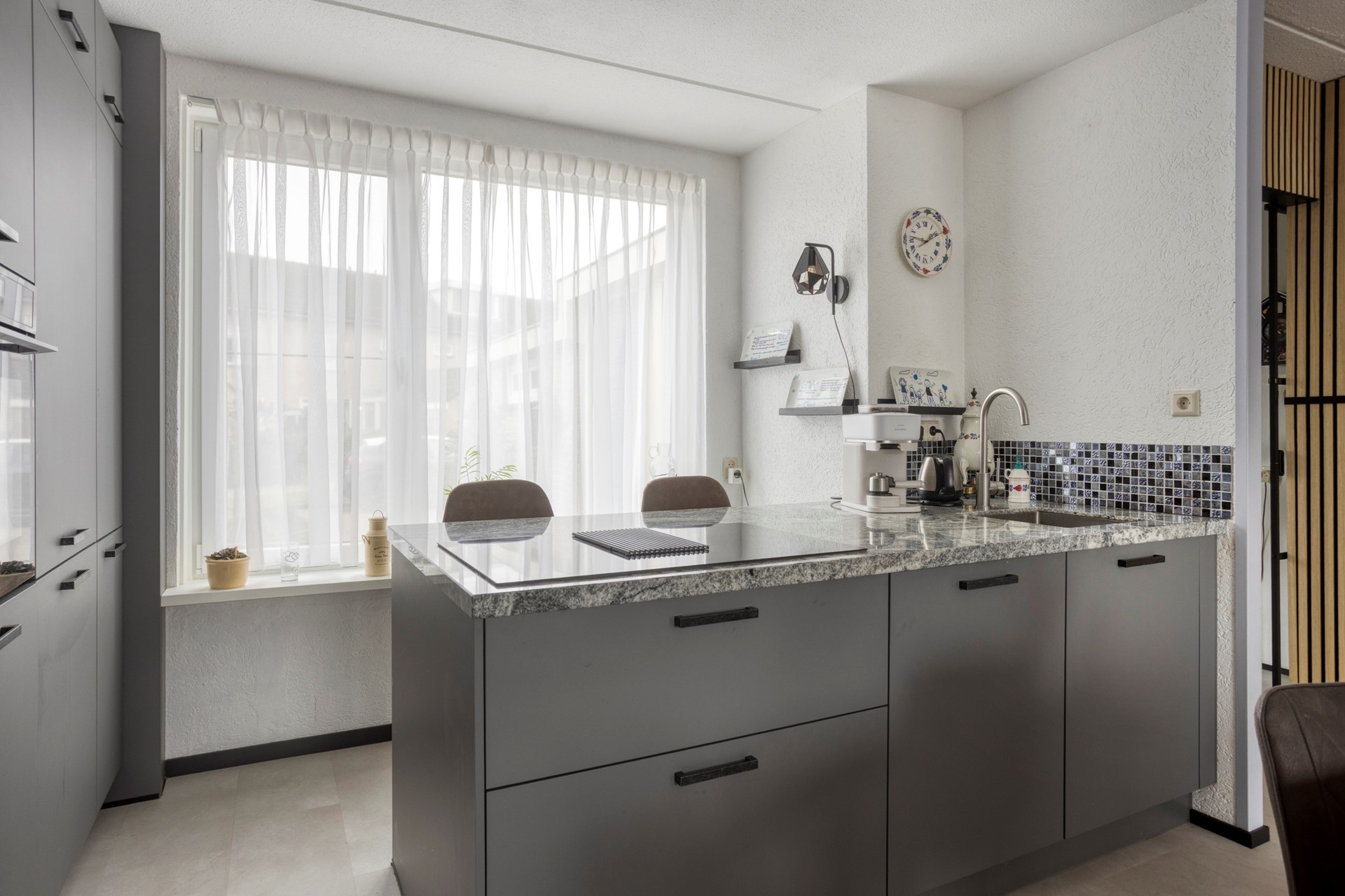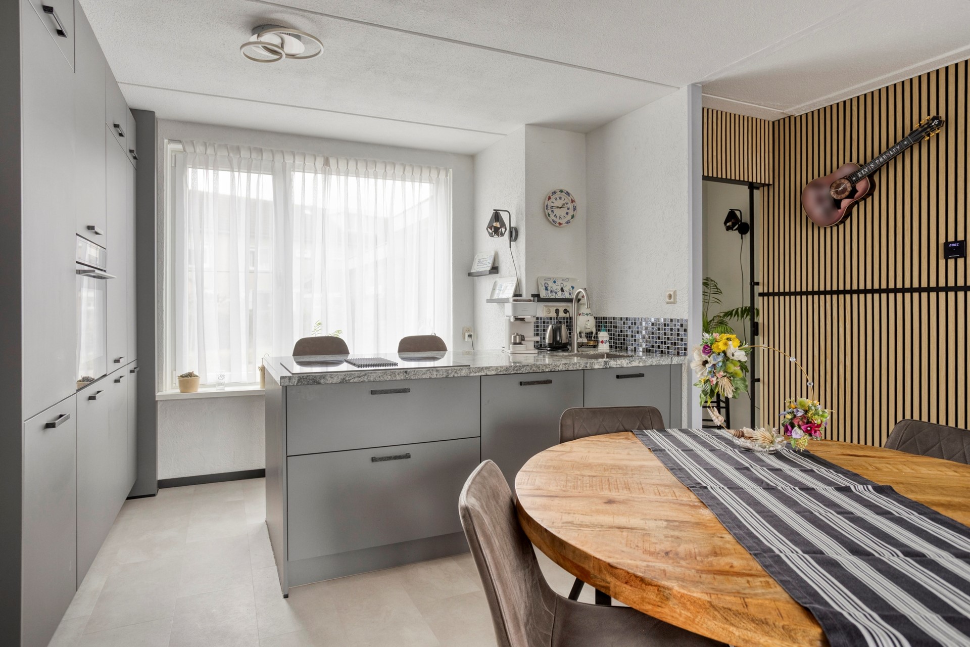 Aan de voorzijde bevindt zich de open keuken, vernieuwd circa drie jaar geleden. De keuken is uitgevoerd in een moderne grijstint en voorzien van diverse inbouwapparatuur en een fraai werkblad. Hier kook je met plezier terwijl je in contact blijft met je gezin of gasten.