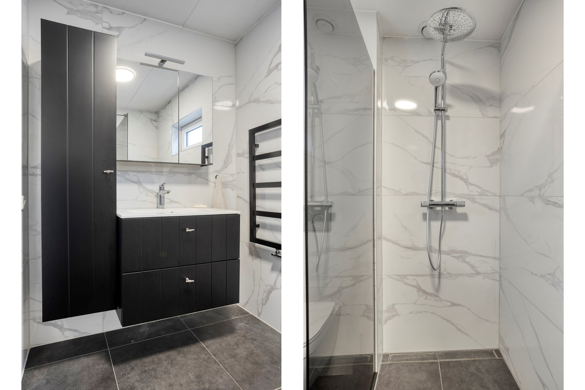 De moderne badkamer, eveneens circa drie jaar oud, is stijlvol afgewerkt met een donkere vloer. De badkamer beschikt over een inloopdouche, wastafelmeubel en toilet. Een frisse en comfortabele ruimte waar je de dag ontspannen begint of afsluit.